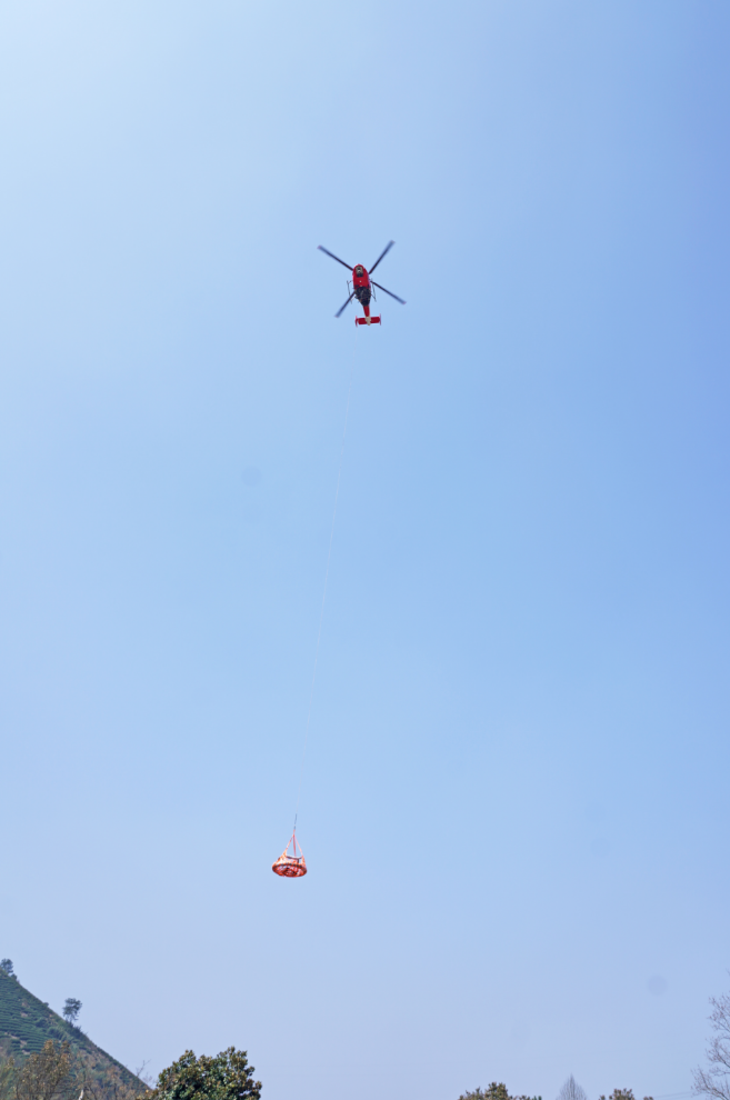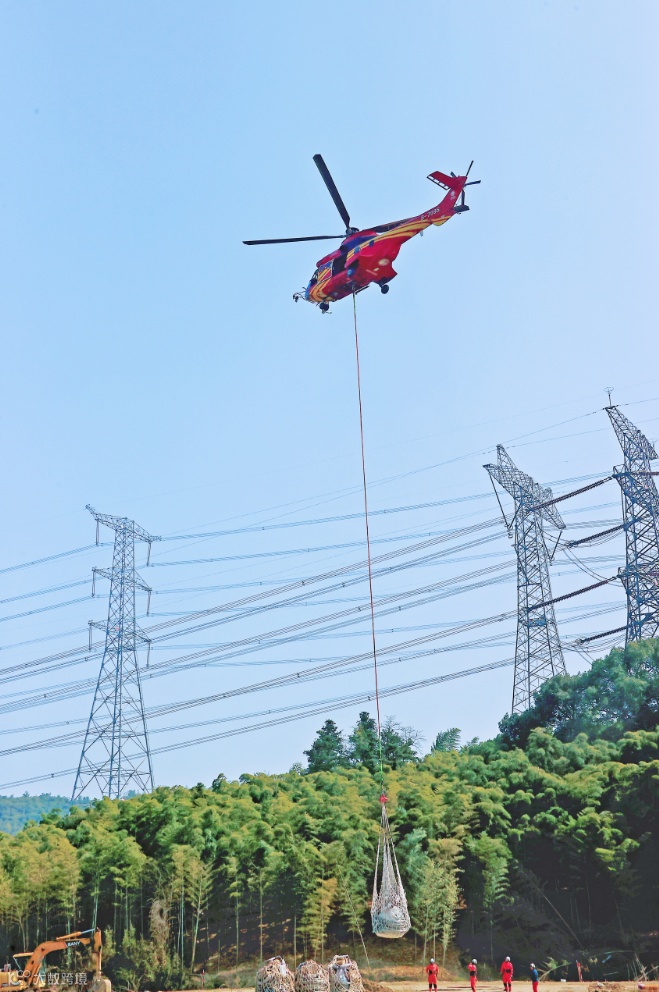 当天,在浙江省湖州市吴兴区东林镇南山村附近,一架中型直升机悬吊着一大包物资向特高压±800千伏复奉线3375号塔飞去。与此同时,在复奉线另一侧,一架重载无人机运载着物资起飞,飞向位于山顶的待检杆塔处。