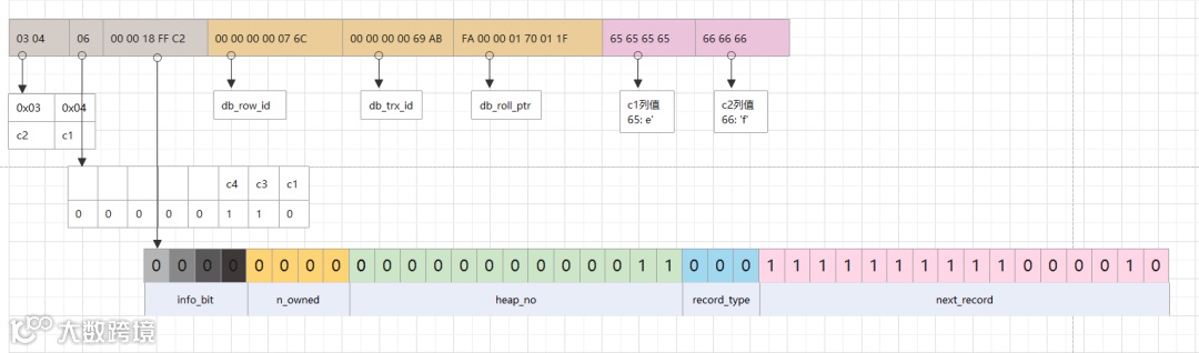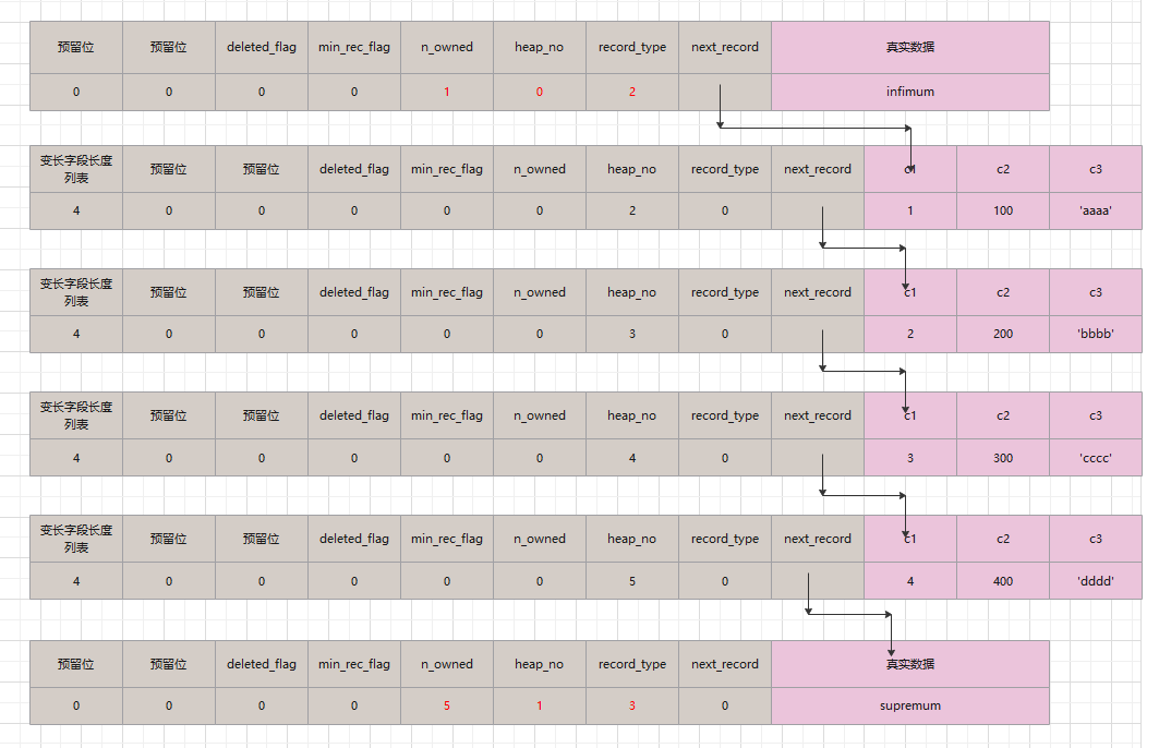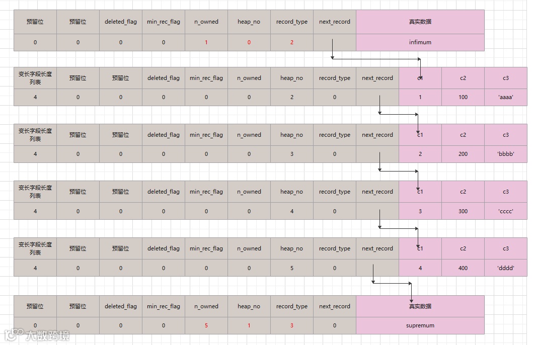 supremum: n_owned=5,表示是某个分组的最后一条记录,当前分组共5条记录;record_type=3;next_record=0,表示记录是本数据页中最后一条记录。