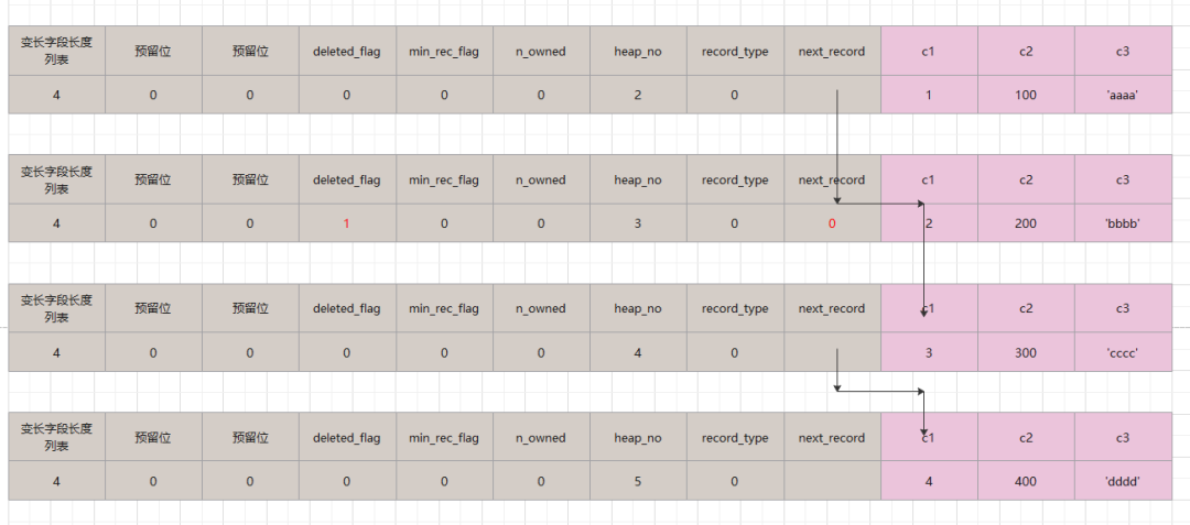 其中变化点为 c1=2 这条数据中,deleted_flag变更成0,next_record=0,但并没有从磁盘上直接清除掉,head_no也未清除。第一条记录的next_record 指向了第三条记录。