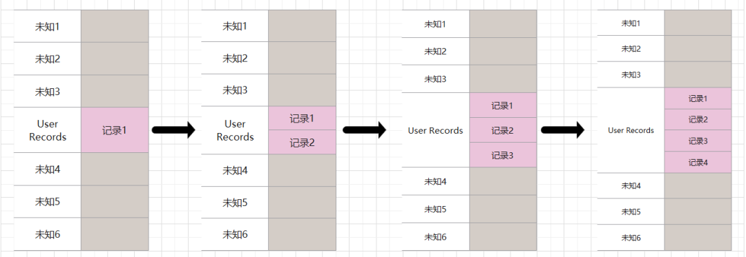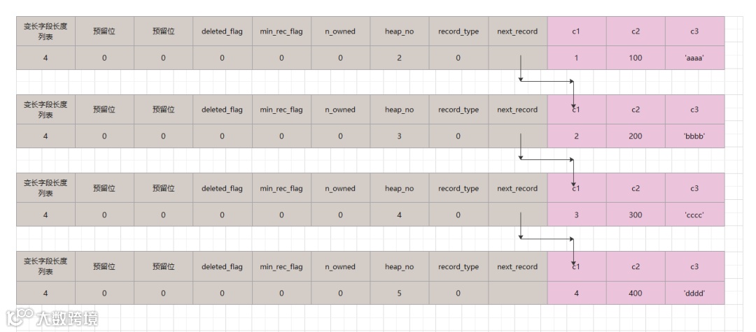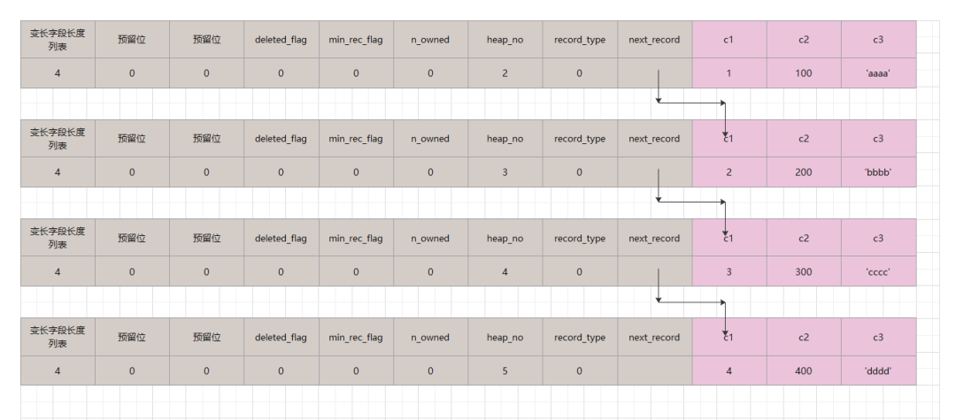 根据行记录结构中的next_recrod属性的含义,多条行记录是以单向链表的形式存储。mysql为了后续更好的查询,单向链表上的记录是按照主键顺序排列的。上述这四条记录,可以显示的画成:
