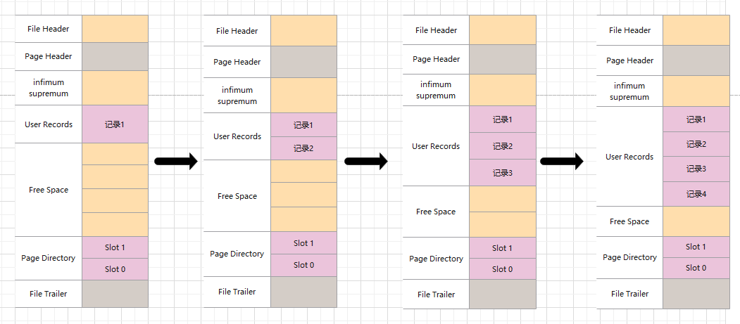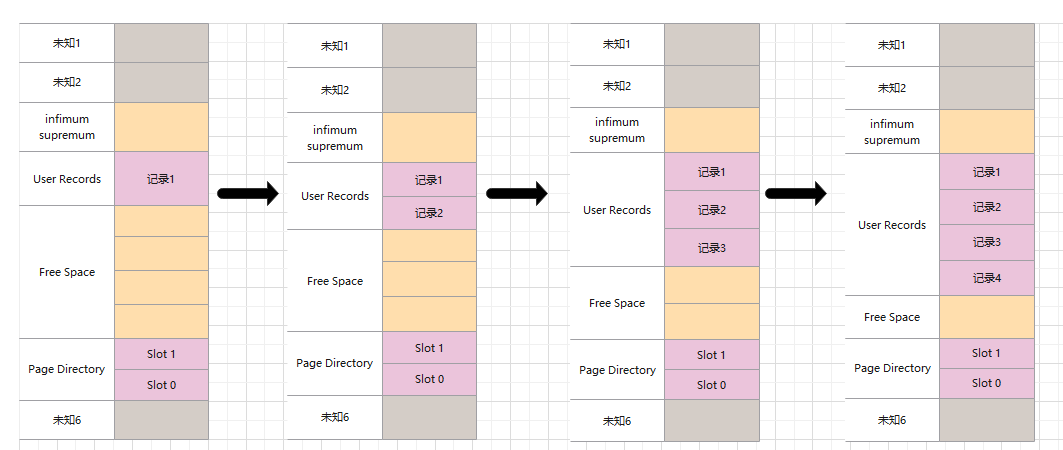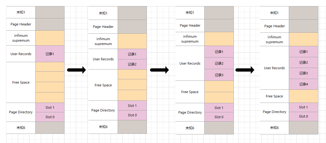 之后每新增一条行记录,都会从Page Directory中找到对应的记录的主键值 比 待新增记录的主键值大 并且差值最小的slot【slot是一个组内最大的那条记录在页面中的地址偏移量,通过slot可以快速找到对应记录的主键值】, 然后把该slot对应的记录的 n_owned值加1,表示本组内新增了一条记录,直到该组中的记录数等于8个。 当一个组中的记录数等于8后,再插入一条记录,会将组中的记录拆分成两个组,其中一个组中是4条记录,另外一个组中是5条记录。拆分过程中,会新增一个slot,记录这个新增分组中最大的那条记录的地址偏移量。