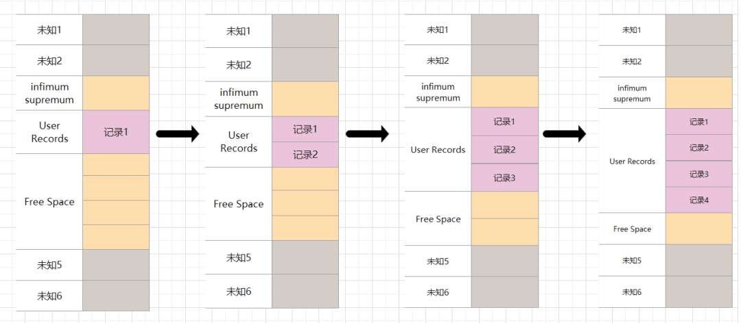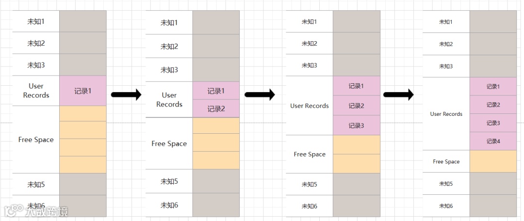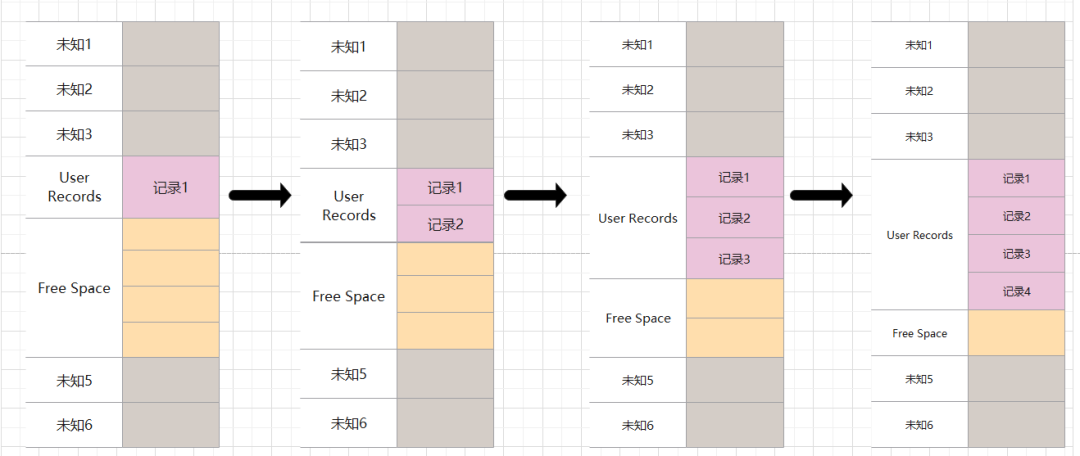 但是一个数据页的空间总共是16K,不会自动增大空间,随着User Records 模块中的行记录越来越多,那么肯定有其他模块的空间就越来越小。这个模块是 Free Space,是页中尚未使用的空间。更新一下上面这个图,补充 Free Space的内容。随着User Records中行记录的增加,Free Space空间则越来越小。