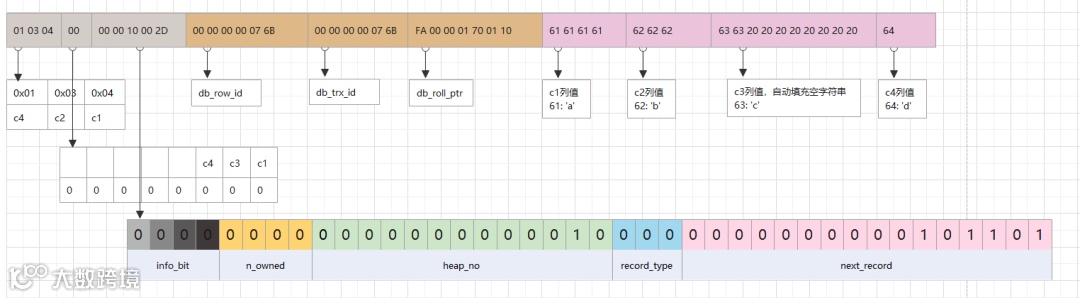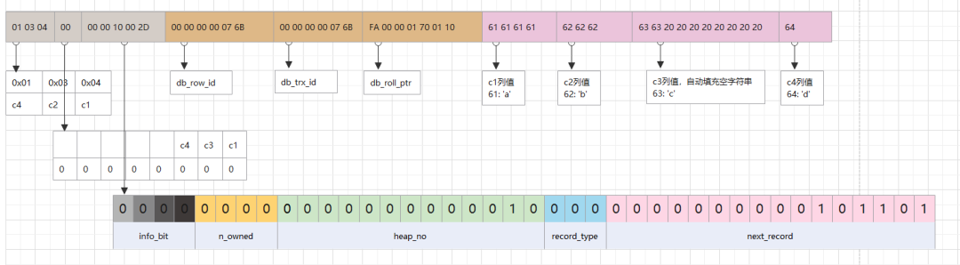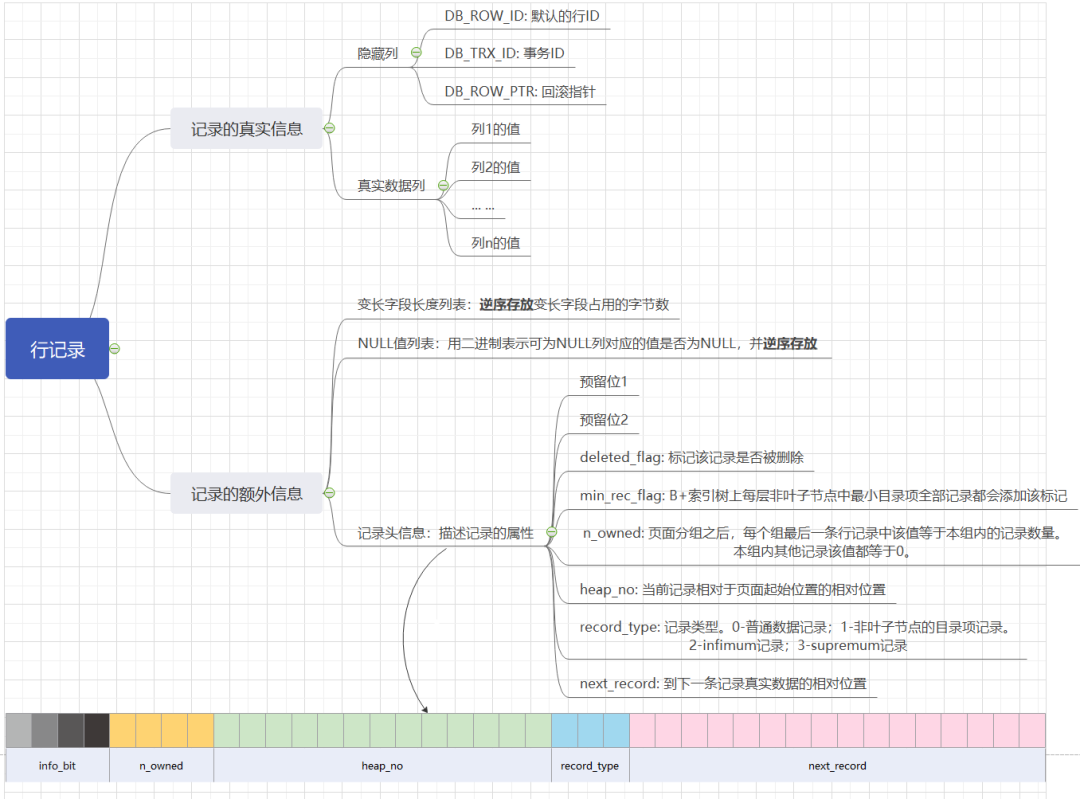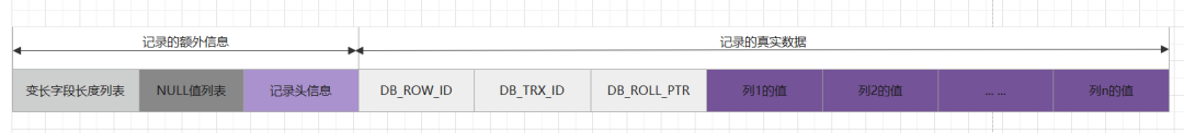 另外,mysql会默认为行记录添加一些列(隐藏列)。上图补充这些隐藏列之后,完整行记录的结构如: