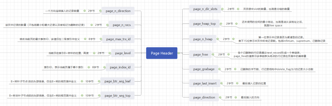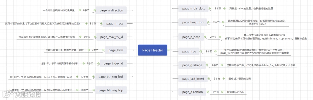 主要作用是标识 数据页中记录了多少条记录,Free Space在页面中的地址偏移量,页目录中包含多少slot等等。