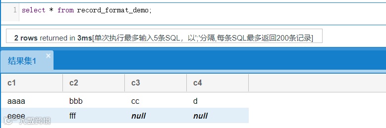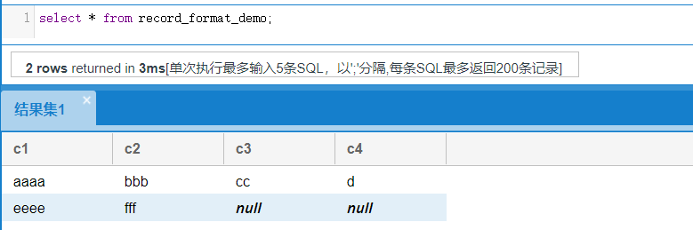 create table record_format_demo(c1 varchar(10),c2 varchar(10) not null,c3 char(10),c4 varchar(10)) charset=ascii row_format=compactinsert into record_format_demo(c1, c2, c3, c4) values("aaaa", "bbb", "cc", "d"),("eeee", "fff", NULL, NULL);