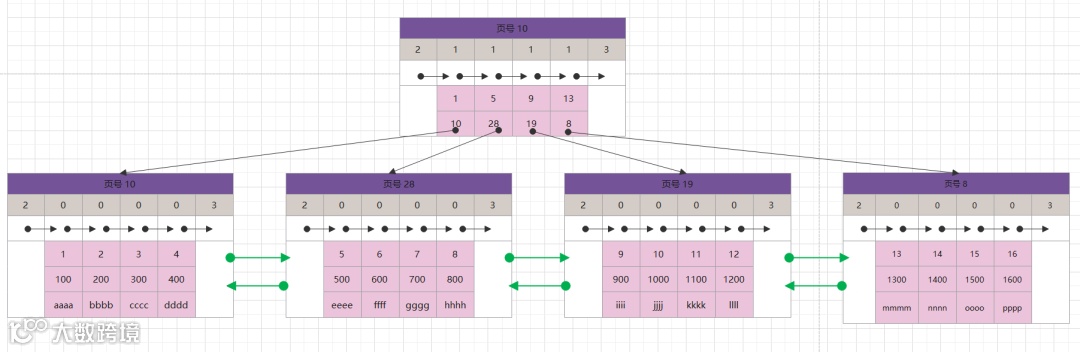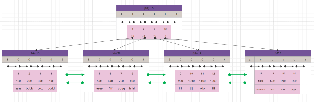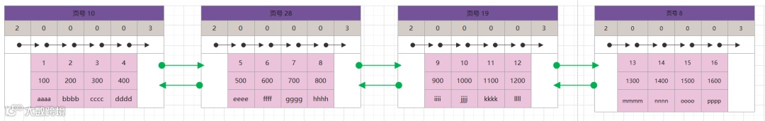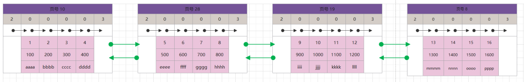 上文使用的数据共有16条,为了演示这个双链表的效果,现在假设【仅仅是假设】每个页中存放不超过4条行记录。则上文的16条记录,形成的数据页双链表结构如下图【此处省略了许多非必要展示的字段】。