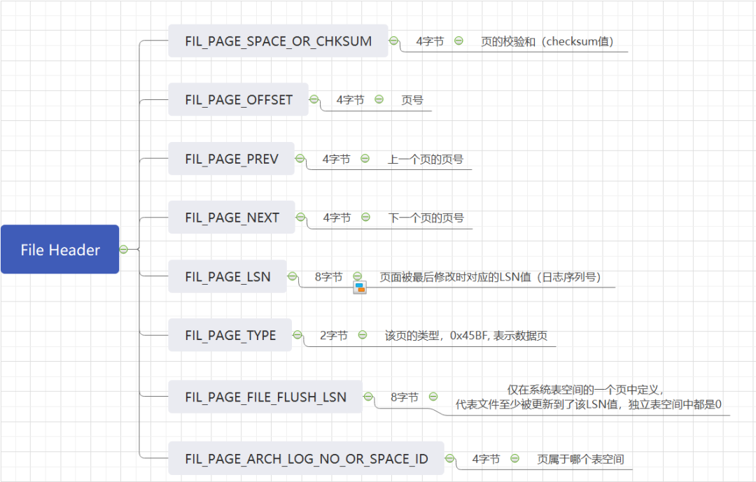 上文中的Page Header 是专门针对数据页记录的各种状态信息。但数据页 仅仅是多种页类型中的一种,其它的还有例如undo日志页,溢出页,存储段信息页,存储区信息页等。因此mysql 使用了File Header 来描述各种页的通用信息。