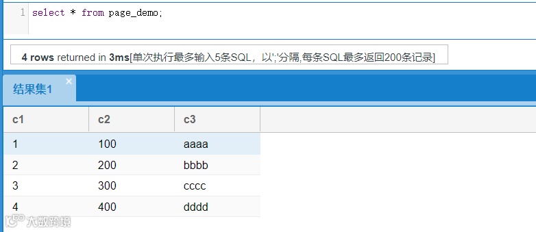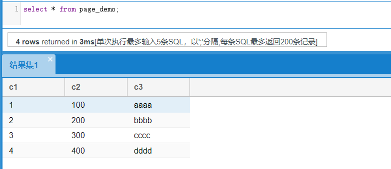 CREATE TABLE page_demo(c1 INT,c2 INT,c3 VARCHAR(10000),PRIMARY KEY (c1)) CHARSET=ascii ROW_FORMAT=Compact;INSERT INTO page_demo VALUES(1, 100, 'aaaa'),(2, 200, 'bbbb'),(3, 300, 'cccc'),(4, 400, 'dddd');