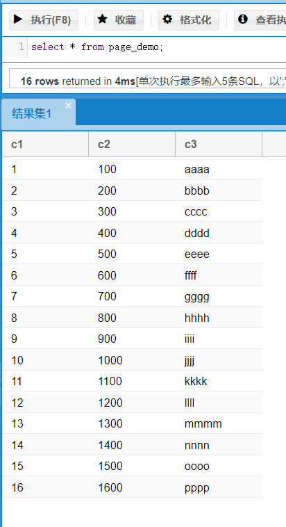 INSERT INTO page_demo VALUES(5, 500, 'eeee'),(6, 600, 'ffff'),(7, 700, 'gggg'),(8, 800, 'hhhh'),(9, 900, 'iiii'),(10, 1000, 'jjjj'),(11, 1100, 'kkkk'),(12, 1200, 'llll'),(13, 1300, 'mmmm'),(14, 1400, 'nnnn'),(15, 1500, 'oooo'),(16, 1600, 'pppp');INSERT INTO page_demo VALUES(5, 500, 'eeee'),(6, 600, 'ffff'),(7, 700, 'gggg'),(8, 800, 'hhhh'),(9, 900, 'iiii'),(10, 1000, 'jjjj'),(11, 1100, 'kkkk'),(12, 1200, 'llll'),(13, 1300, 'mmmm'),(14, 1400, 'nnnn'),(15, 1500, 'oooo'),(16, 1600, 'pppp');