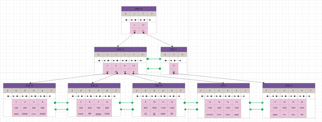 叶子节点与非叶子节点中的行记录按照主键大小顺序排成一个单向链表,页内的记录被划分成若干组。可以利用Page Directory进行二分法快速查找到行记录。 -