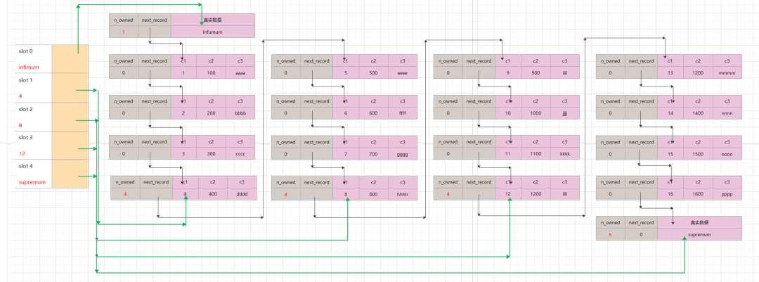 对于上面的单链表,其它行记录的owned值 都为零。也就是说,infimum单条记录作为一个组,剩余的四条行记录+supremum记录作为一个组。