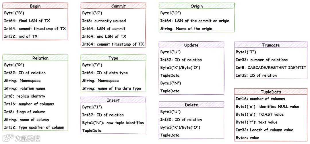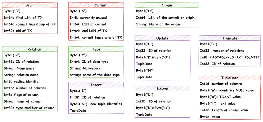 输出插件负责将WAL日志解码为可读的格式,常用的插件用test_decoding(多用来测试),pgoutput(默认使用),wal2json(输出为json)。PostgreSQL定义了一系列回调函数,我们除了使用上述插件,可以通过回调函数编写自己的输出插件。