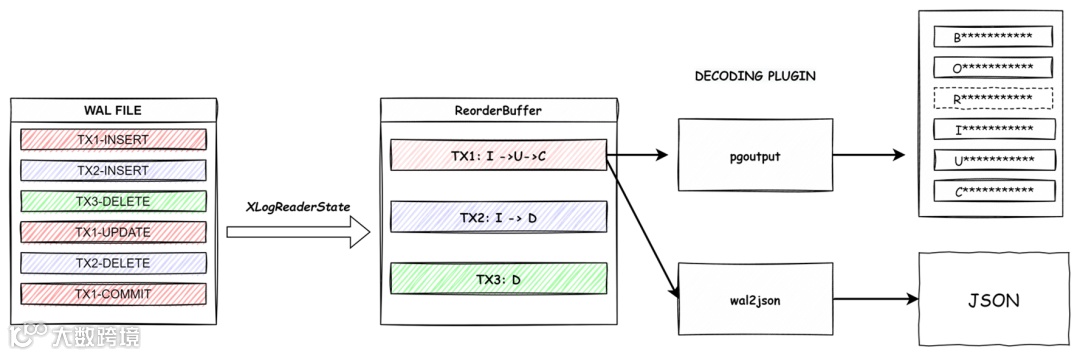 当我们了解了概念之后,来看一下整个解析的工作流程。由于WAL文件里一个事务的内容并不一定是连续的,所以需要通过Reorder后放在buffer中,根据事务ID组织成一条消息,COMMIT后发送给输出插件,输出插件解析后将消息流发送给目标端。