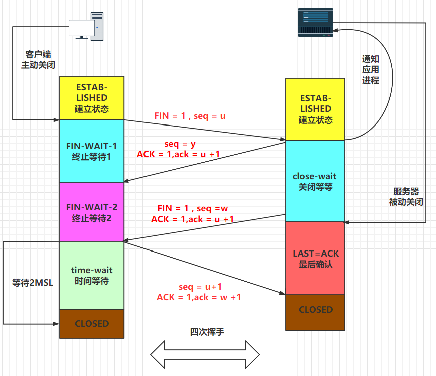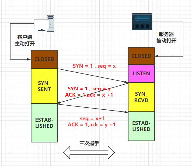 客户端收到后发送ACK =1, seq = x+1,ack = y+1给服务器,此时客户端状态是ESTAB-LISHED -