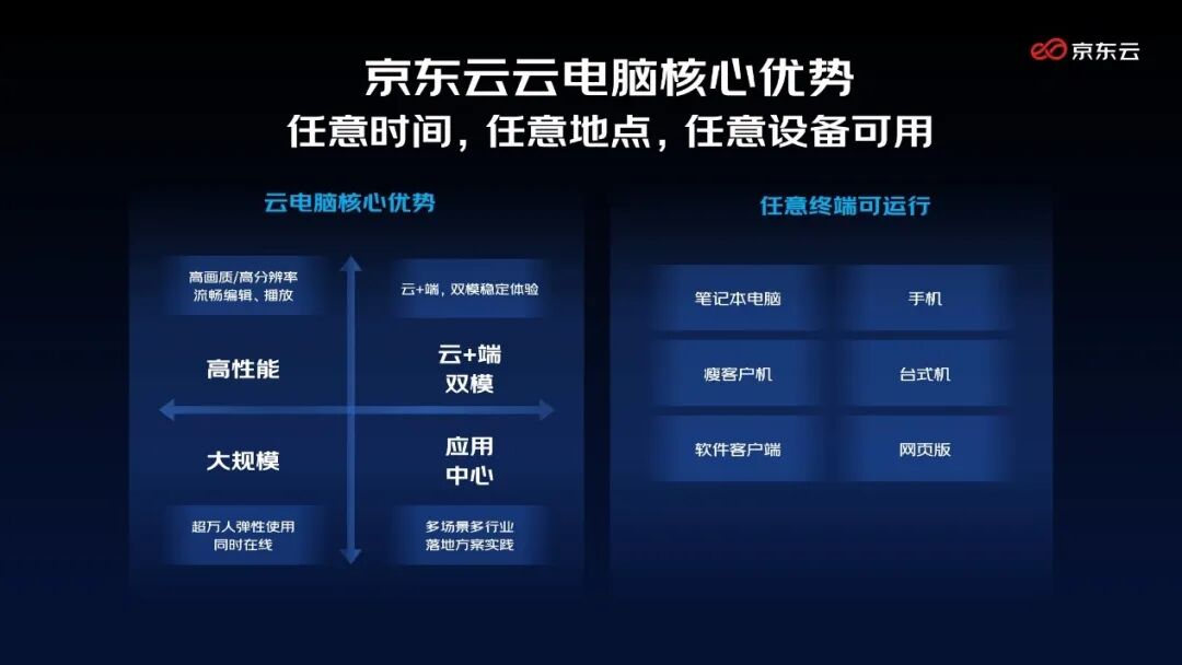 针对于此,京东云研发推出云电脑产品,支持在任意终端(台式机、笔记本电脑、手机、客户机等)上免安装使用云电脑服务,同时配备云计算的无限算力、数据不落地的企业级安全能力和贴近业务场景的性能定向优化等特点,真正实现多场景无边界的融合办公体验。