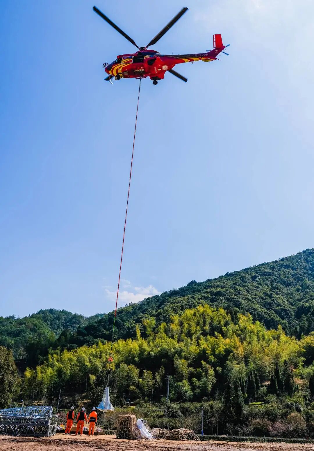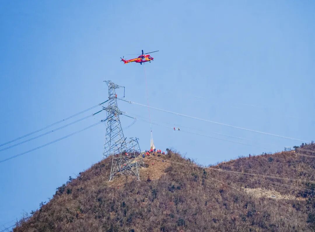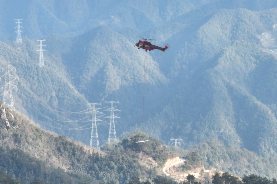 3月3日,丽水市缙云县三溪村附近回响着巨大的轰鸣声,一架红色直升机往返于材料堆放点和施工现场,进行500千伏仙永线028号、030号抗冰抢险施工工器具设备和塔材吊装运输作业。