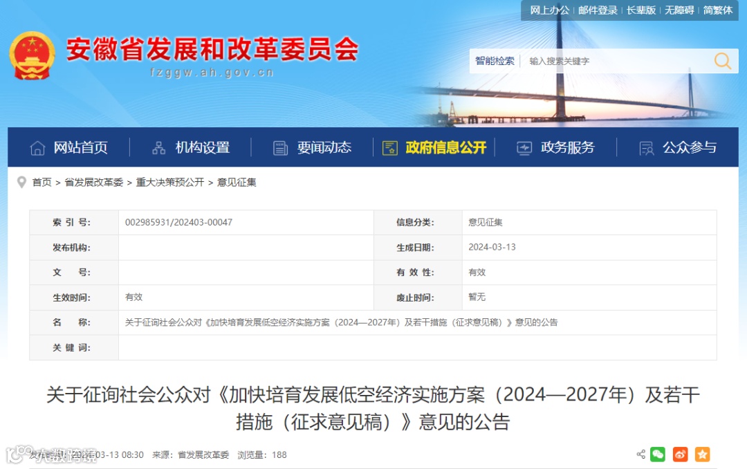 3月13日,安徽省发展改革委就《加快培育发展低空经济实施方案(2024-2027年)及若干措施(征求意见稿)》公开征求意见,征求意见截止日期为2024年3月26日。《实施方案》提出,到2025年,低空基础设施建设加快推进,建成一批应用示范场景,低空经济规模和创新能力快速提升,集聚化产业生态初步形成。到2027年,低空基础设施进一步完善, 应用场景不断拓展,低空经济规模和创新能力达到全国领先水平,打造合肥、芜湖两个低空经济核心城市,发挥六安、滁州、马鞍山等市低空制造业配套优势,彰显安庆、 宣城等市低空服务业特色,基本形成双核联动、多点支撑、 成片发展的低空经济发展格局。