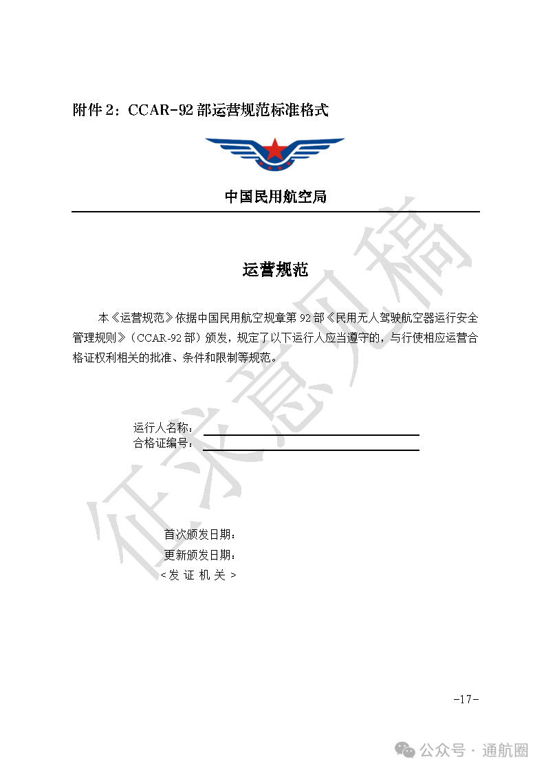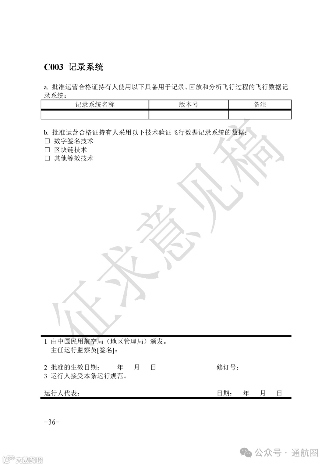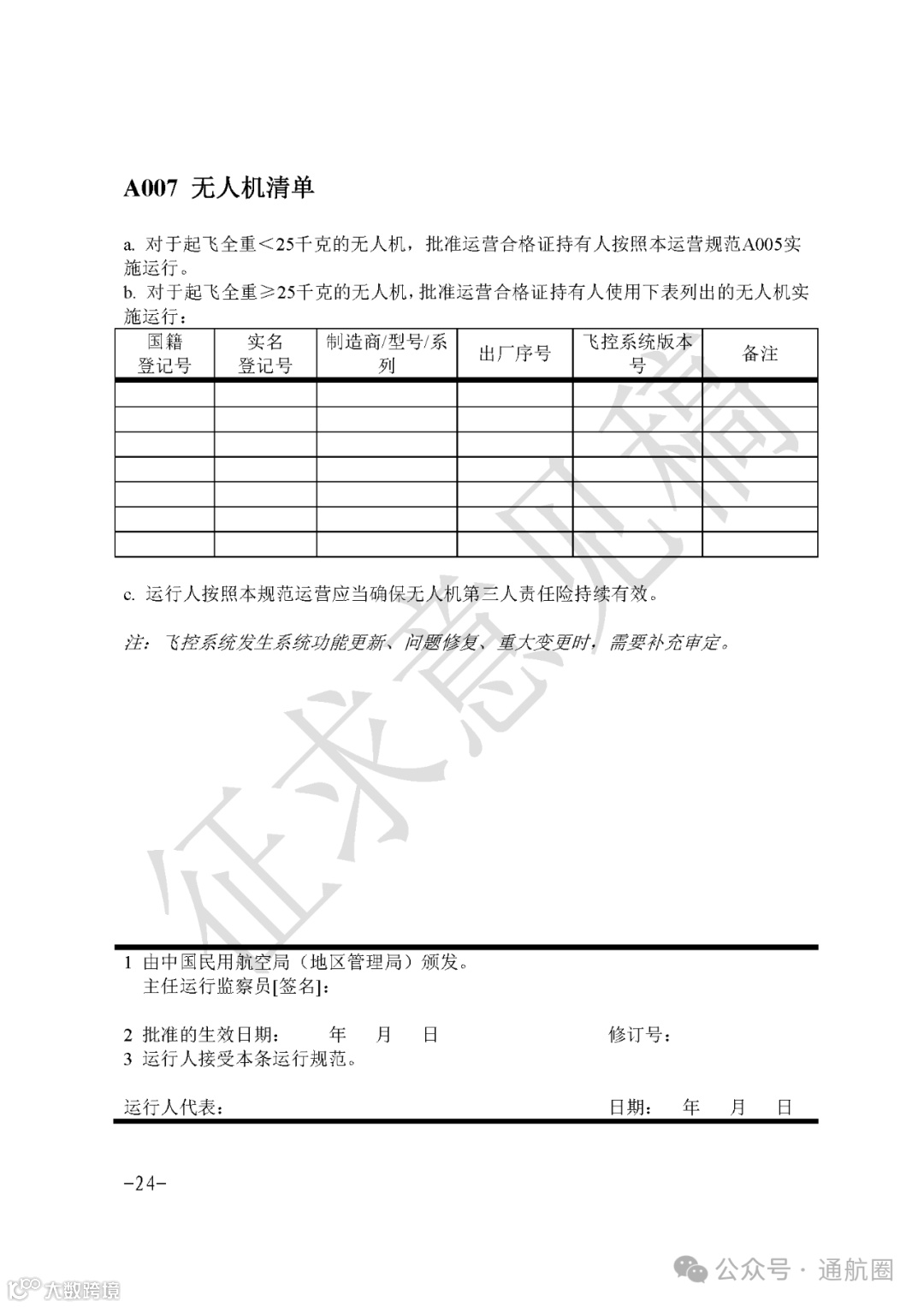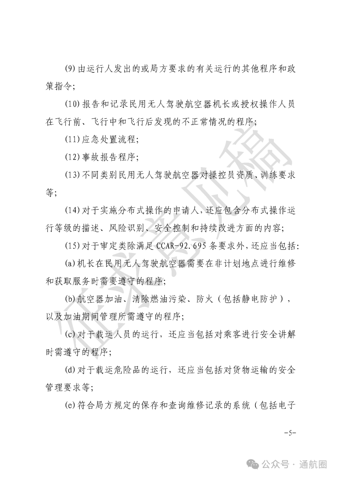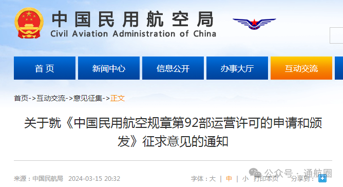 3月15日晚,民航局飞行标准司、运输司联合发布通知,就《中国民用航空规章第92部运营许可的申请和颁发》征求意见。该文件旨在推进《民用无人驾驶航空器运行安全管理规则》(CCAR-92部)运营许可的有序实施,明确许可申请流程和要求,规范运营安全评估实施的范围和要点,细化运行管理要求。任何单位和个人如有相关意见或者建议,可于2024年3月31日前以电子邮件形式反馈至fs_report@caac.gov.cn。
