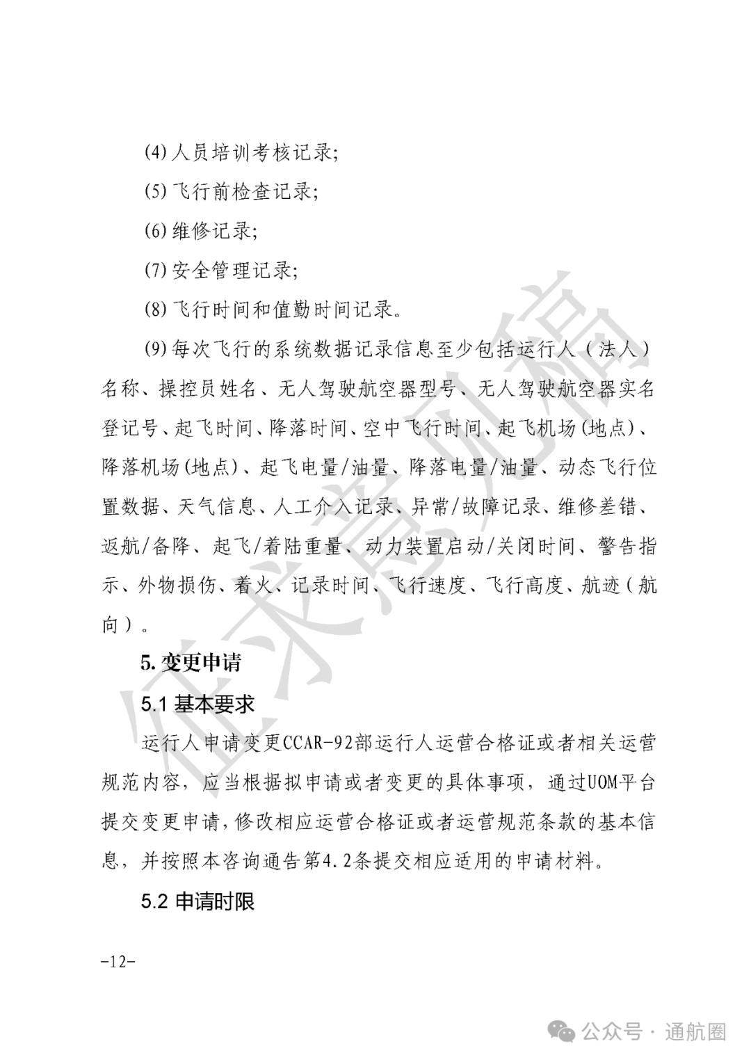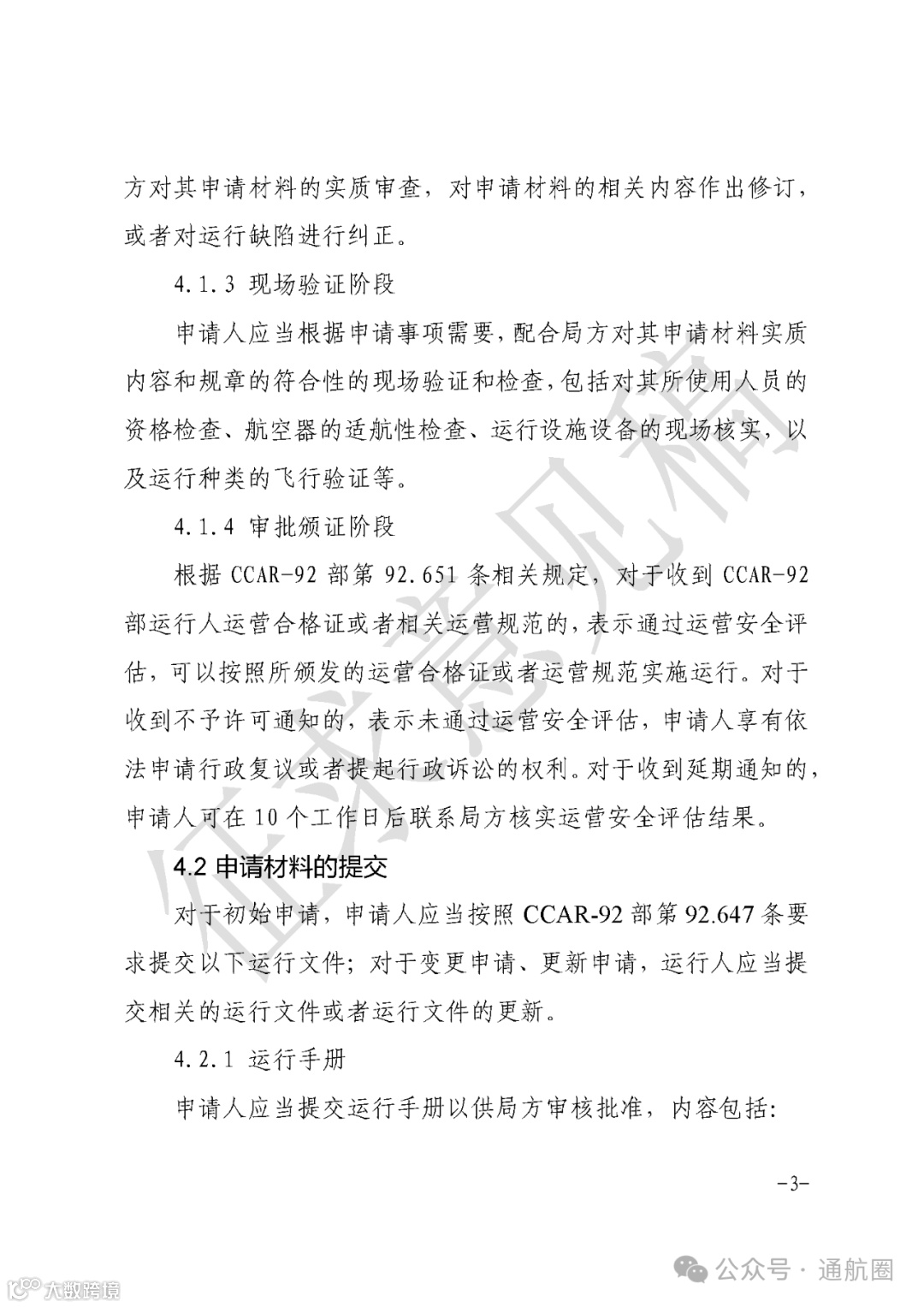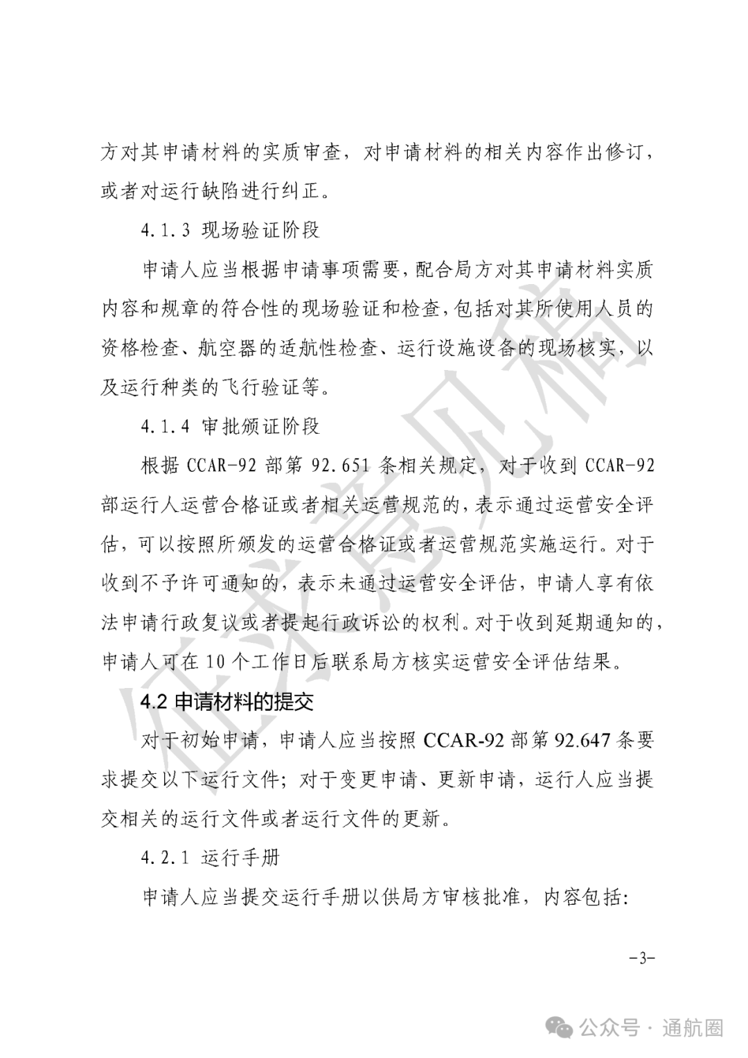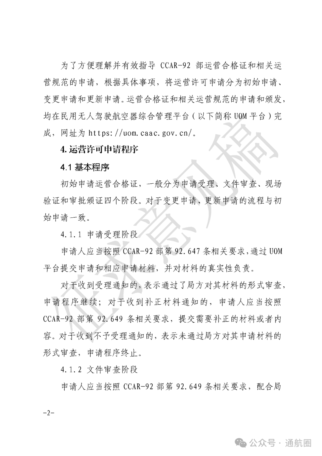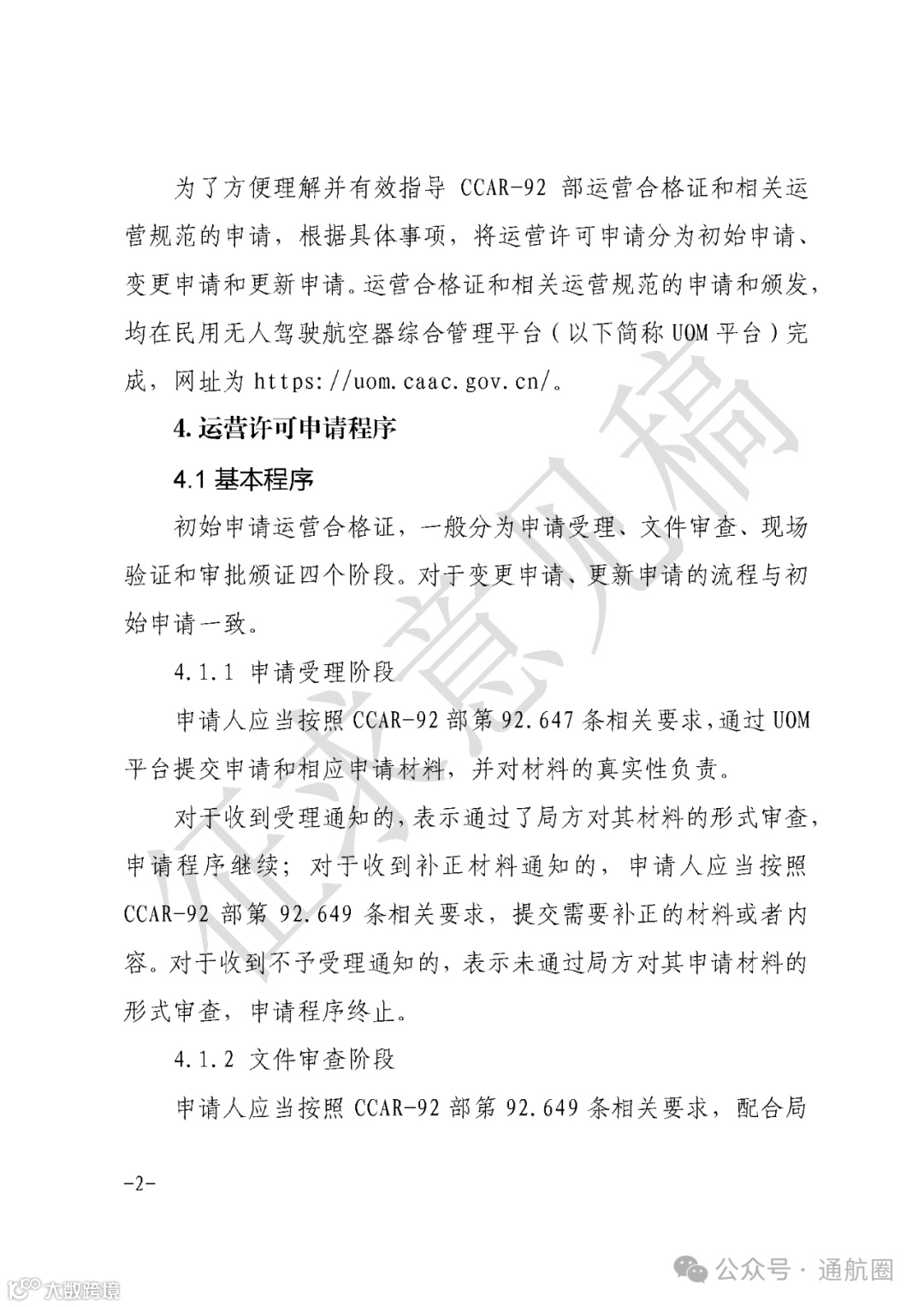 关于运营许可申请程序,初始申请运营合格证,一般分为申请受理、文件审查、现场验证和审批颁证四个阶段。对于变更申请、更新申请的流程与初始申请一致。申请人应当按照CCAR-92部第92.647条相关要求,通过UOM平台提交申请和相应申请材料,并对材料的真实性负责。详情见征求意见稿: