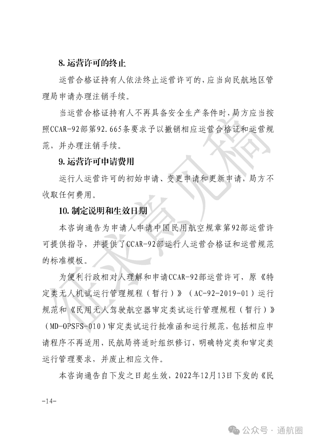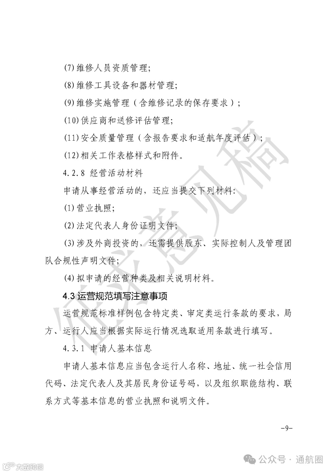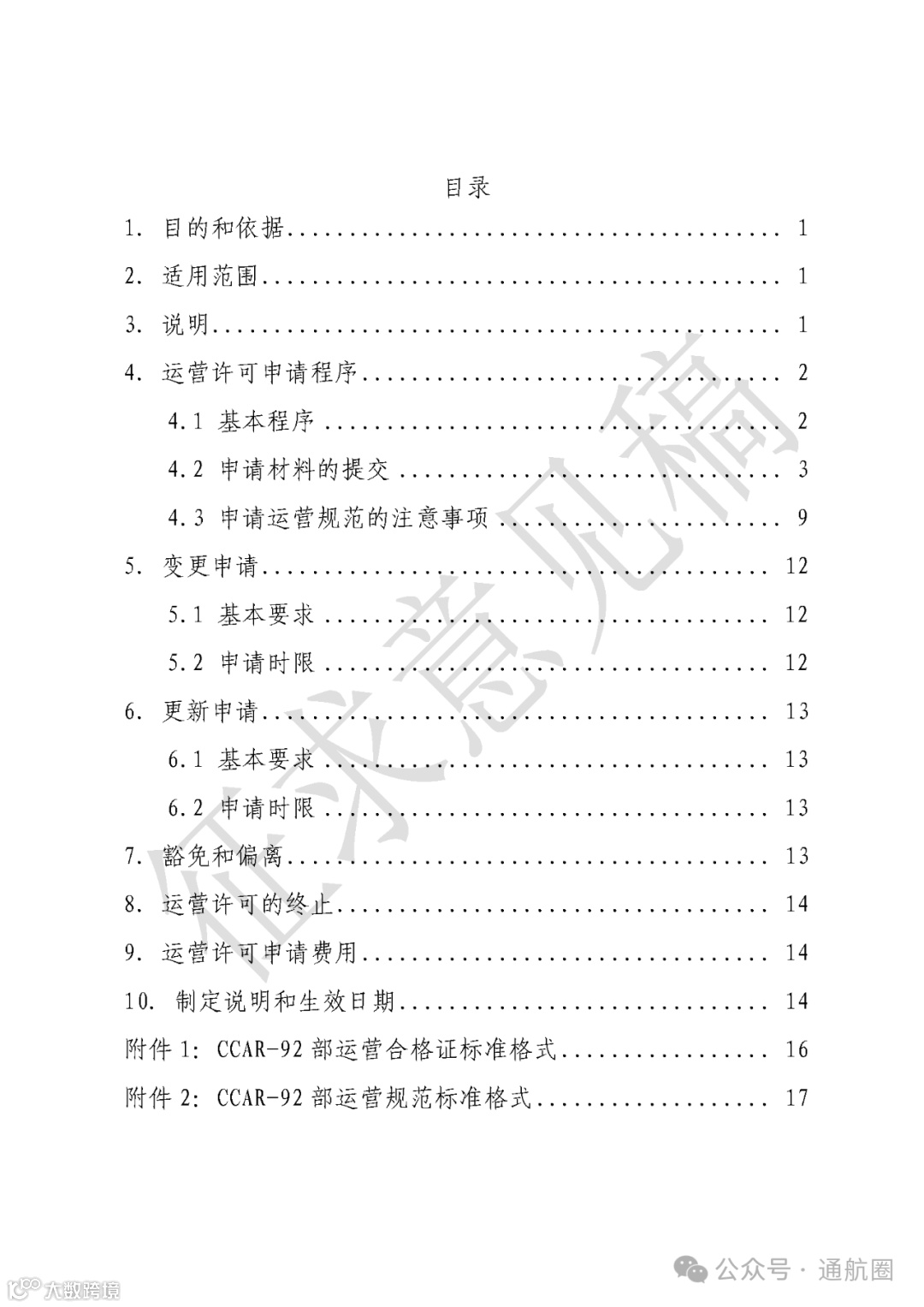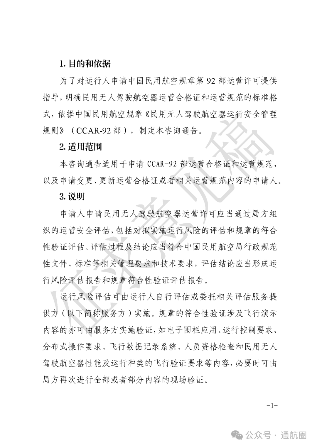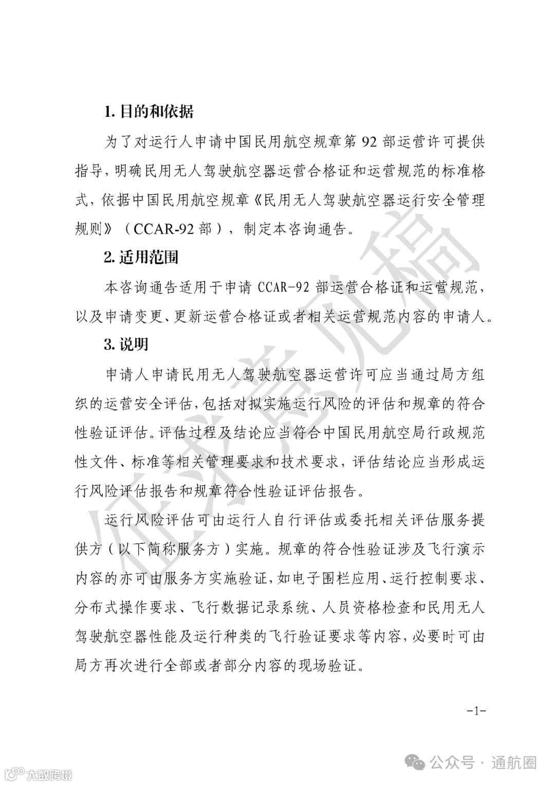 根据征求意见稿,该文件适用于申请CCAR-92部运营合格证和运营规范,以及申请变更、更新运营合格证或者相关运营规范内容的申请人。申请人申请民用无人驾驶航空器运营许可应当通过局方组织的运营安全评估,包括对拟实施运行风险的评估和规章的符合性验证评估。评估过程及结论应当符合中国民用航空局行政规范性文件、标准等相关管理要求和技术要求,评估结论应当形成运行风险评估报告和规章符合性验证评估报告。