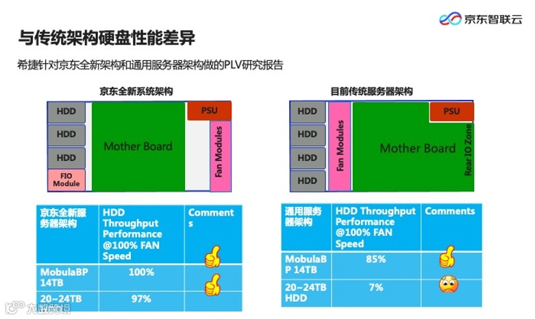 京东智联云邀请希捷对自研模块化服务器与传统服务器进行了对比测试,分别测试服务器在14T和20-24T机械硬盘下性能表现。14T机械盘的情况下京东智联云自研服务器性能接近百分之百,传统服务器只达到85%;20-24T的情况下,京东智联云自研服务器Performance loss为3%,性能达到97%,但传统服务器性能已降为7%,几乎为不可用状态,更无法满足对性能有较高要求的互联网企业。