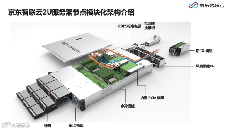 在京东智联云自研模块化服务器的全新架构设计中,最大的亮点是前后两个IO模块设计,能够做到灵活切换前后IO,后IO可以适用于没有理线架而无法支持前端IO的标准机柜,灵活的模块化设计可适用于更多部署场景的数据中心。图中详细拆解展示了京东智联云自研模块化服务器的设计思路,前端放置硬盘、前IO模组,中间为主板,主板后为PCIE模组可外接PCIE卡,尾部放置风扇,或增加后IO模组。另外,服务器支持CRPS标准电源,同时也支持电源转化模组,方便整机柜电源集中管理。京东智联云自研模块化服务器还设有上水冷模组,可实现风冷+水冷的风液混合散热模式。