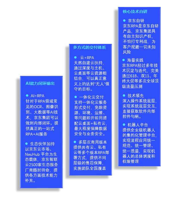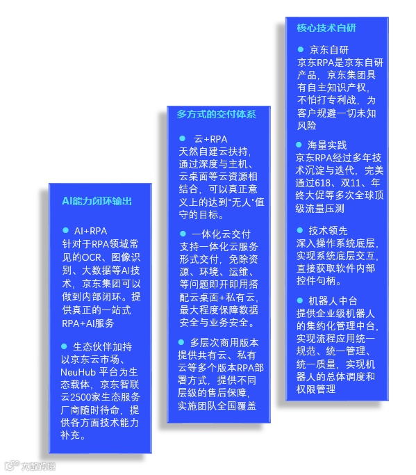 京东RPA使用核心自研技术,结合云属性,集成自研AI能力,提供全方位的一站式。
