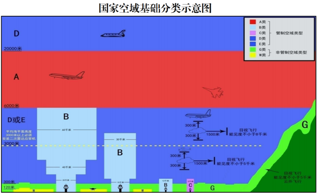 实际上,按照最新的《国家空域基础分类方法》规定,6000米以下的空域,除了B类和C类这两类临近机场的空域以外,均可以运行通用飞机和无人机,是未来低空经济的运行高度。但为什么普遍认为低空范围是3000米以下的空域呢?主要因为传统的通用飞机以载人为主,适航规定的最大起飞重量限制为5.7吨,最大载客19人,由于这类通用飞机并不配备增压系统,在3000米以上运行时,乘客的呼吸会感到非常困难,所以大家看到大多数载人的通用飞机一般在3000米以下飞行。对于无人机而言,不需要考虑人的因素,飞行高度只取决于发动机的动力形式,主要考虑的是燃油经济性,只要不影响A类空域的民航飞机运行,不干扰B类和C类民航和通用机场附近的起降,无人机都可以正常运行。