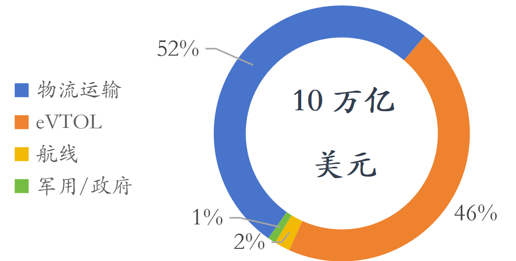 摩根士丹利预测,到2040年,全球城市空中交通(UAM,Urban Air Mobility)的产业规模将达到10万亿美元,其中物流运输占52%,evtol共享出行占46%,政府和军事用途占1%,客运航线占2%。从国别上分,中美两国各占约27%,是最大的两个竞争对手。