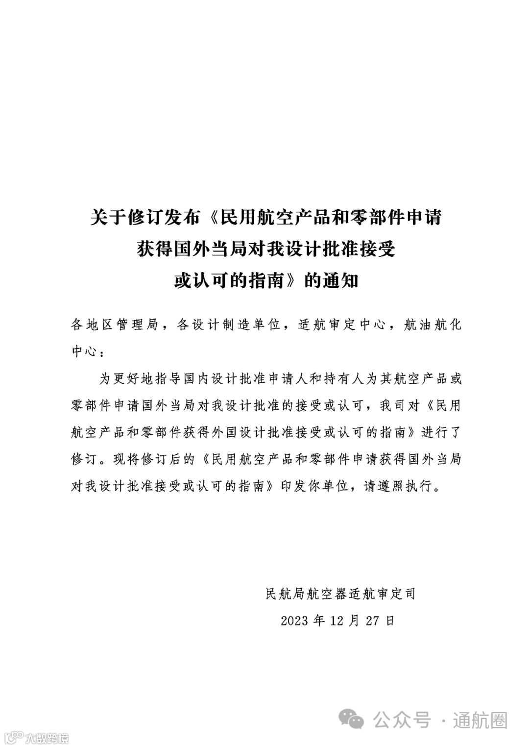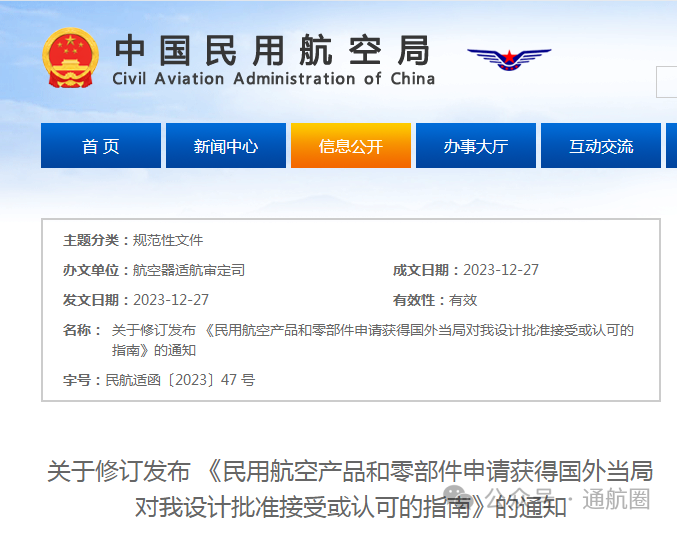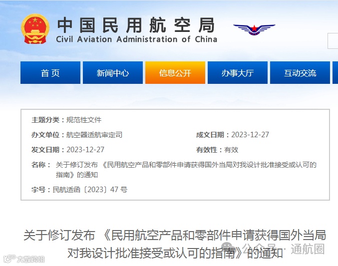 据通航圈自民航局获悉,继印发新修订的《型号合格审定程序》《生产批准和监督程序》等11部重要适航文件后(民航局印发11部重要适航文件),民航局适航司又于近日印发了关于修订发布 《民用航空产品和零部件申请获得国外当局对我设计批准接受或认可的指南》的通知(民航适函〔2023〕47 号),以便更好地指导国内设计批准申请人和持有人为其航空产品或零部件申请国外当局对我设计批准的接受或认可。该文件自发布之日起实施。
