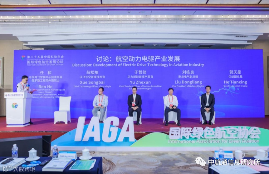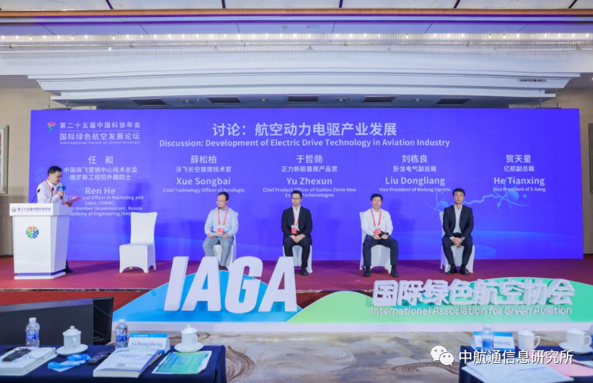 讨论:航空动力电驱产业发展。在中国商飞营销中心技术总监、俄罗斯工程院外籍院士任和的主持下,沃飞长空薛松柏首席技术官、正力新能于哲勋首席产品官、卧龙电气刘栋良副总裁、亿航贺天星副总裁展开航空动力电驱产业发展的讨论。