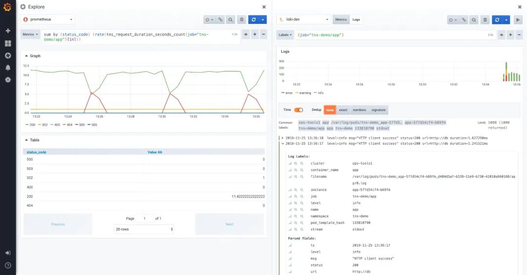 在Grafana中原生支持Loki插件,将监控和日志查询集成在一起,在同一UI界面中可以对监控数据和日志进行side-by-side的下钻查询探索,比使用不同系统反复进行切换更直观、更便捷。