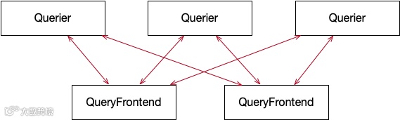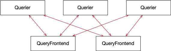 每个querier都与所有queryFrontend建立grpc双向流式连接,实时从queryFrontend中获取已经分割的子查询求,执行后将结果发送回queryFrontend。具体如何分割查询及在querier间调度子查询将在queryFrontend环节介绍。