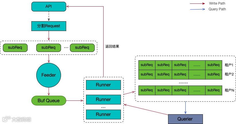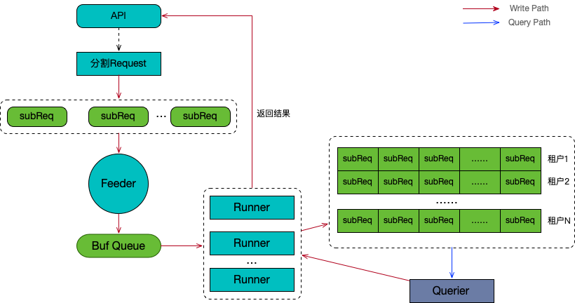 从Buf Queue中竞争方式读取子查询并写入到下游的请求队列中,并处理来自Querier的返回结果。Runner的并发个数通过全局配置控制,避免因为一次分解过多子查询而对Querier造成巨大的徒流量,影响其稳定性。