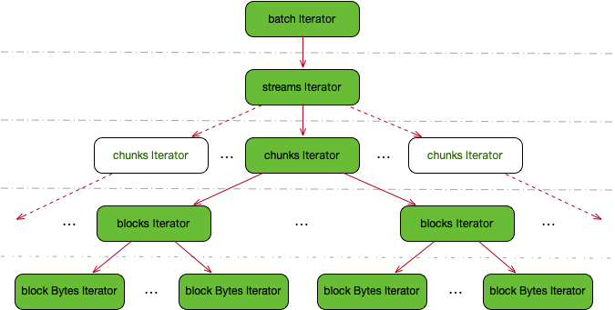 * batch Iterator:以批量的方式从存储中下载chunk原始数据,并生成iterator树;
