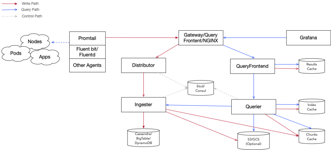 整体上Loki采用了读写分离的架构,由多个模块组成。其主体结构如下图所示: