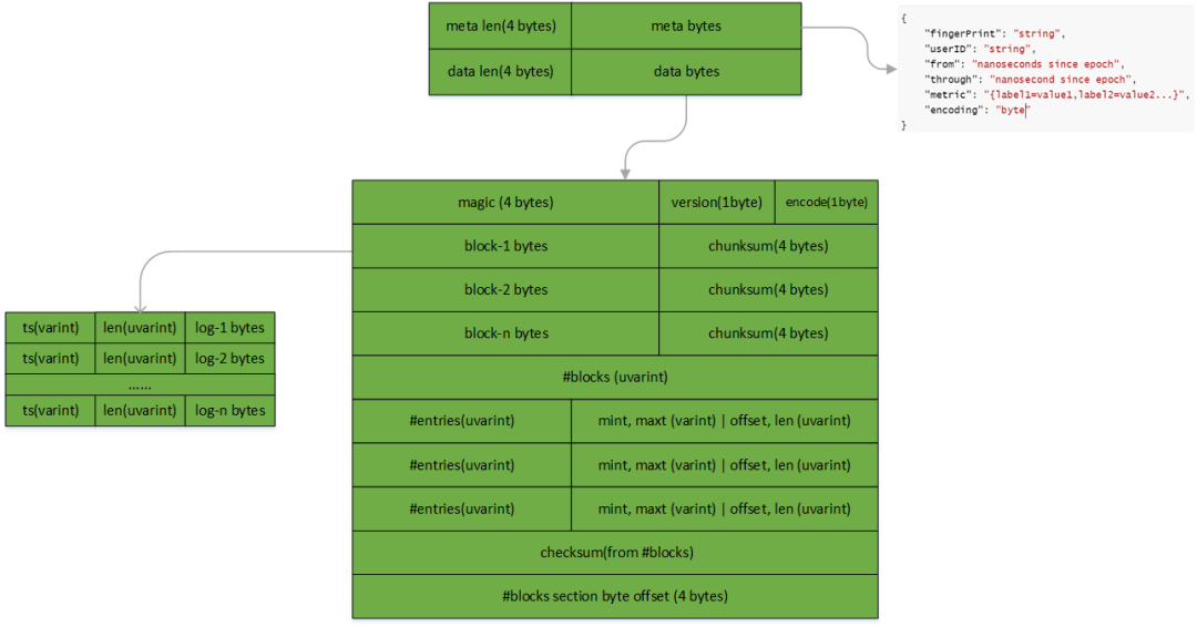 * meta:封装chunk所属stream的指纹、租户ID,开始截止时间等元信息;