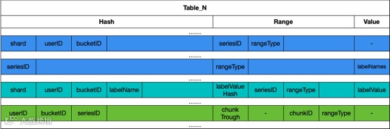 seriesID为日志流ID, shard为分片,userID为租户ID,labelName为标签名,labelValueHash为标签值hash,chunkID为chunk的ID,chunkThrough为chunk里最后一条数据的时间这些数据元素在映射过程中的作用在Querier环节的[查询流程]((null))做详细介绍。