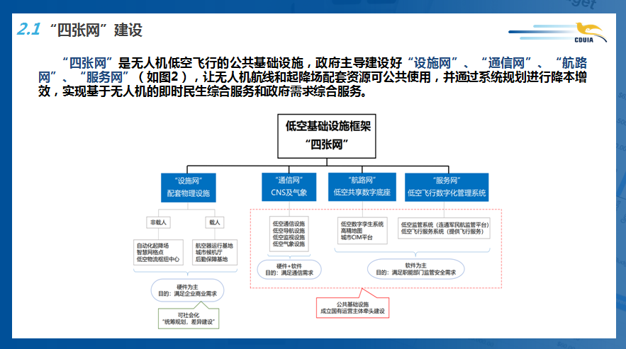 会上发布的《成都市无人机低空经济产业发展报告》,提出了低空经济产业发展436“成都方案”:建设无人机低空飞行的公共基础设施“四张网”(设施网、通信网、航路网、服务网),让无人机航线和起降场配套资源可公共使用,并通过系统规划进行降本增效,实现基于无人机的即时民生综合服务和政府需求综合服务。大力开发开放应用场景,强化政府与市场的双轮驱动,全面发挥各种所有制经济的作用,大力推进公共服务、生产、消费类飞行服务,形成各具特色、相互支撑、一体发展的良好局面,实现商业成功;并为此提出了建立成都市高效快捷的低空经济产业管理体系、出台具有成都特色的无人机低空经济产业发展实施方案和支持措施系列政策文件、充分探索和挖掘成都城市低空空域资源、由国有资本牵头建设成都市无人机低空经济公共基础设施、大力开发成都市低空经济产业发展市场环境、成立成都市低空经济关键技术创新中心等六点实施建议。