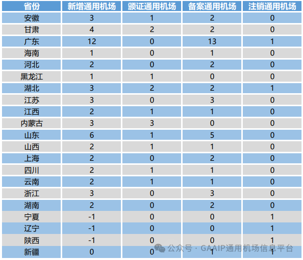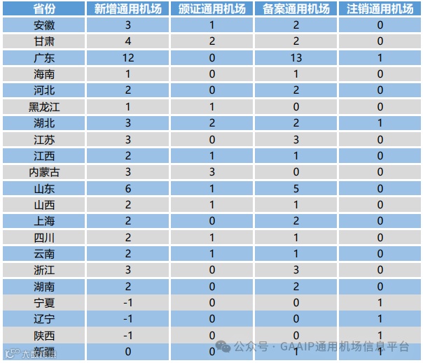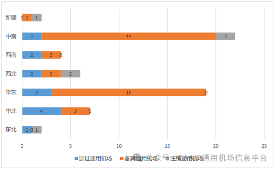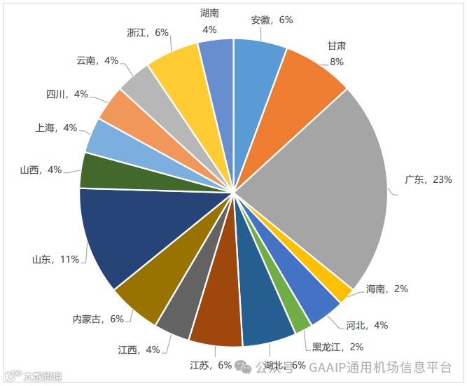 2023年,全年通用机场数量增加50个,其中新增颁证通用机场15个(均为A1级通用机场),备案通用机场41个,注销通用机场6个。华东地区通用机场新增数量最多,为19个,占比为38%;中南地区次之,新增通用机场18个,占比36%。从省份方面来看,广东省通用机场新增数量最多,为12个,占比为24%;山东省次之,新增通用机场数量为6个,占比12%。综上,全国各地区、各省份间通用机场发展差异较大,中南地区与华东地区各省份通用机场建设力度较大,而新疆与东北地区通用机场数量增加较为缓慢。