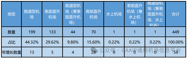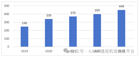 据中国AOPA通用机场研究中心统计,截至2023年12月31日全国在册通用机场已达449个,其中取得通用机场使用许可证的机场106个,通过通用机场信息管理系统完成备案的机场(B类通用机场和仅供直升机起降的A类通用机场)343个。较2022年全国通用机场数量同比增长50个,同比增长率12.5%;较2021年全国通用机场数量同比增长79个,同比增长率21.4%。