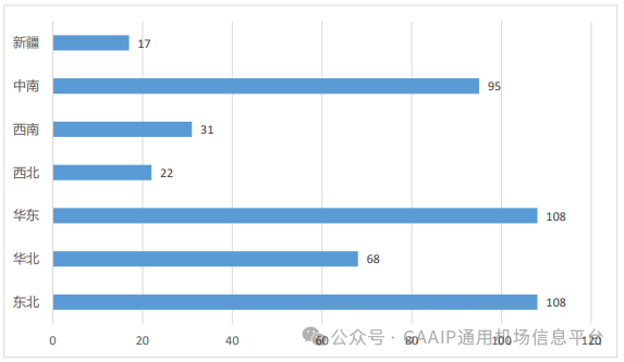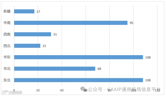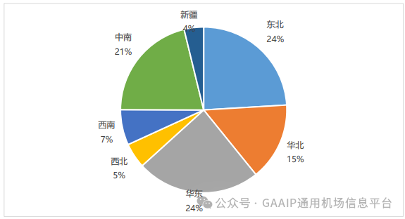截止2023年12月31日,全国通用机场地区分布差异较大,东北地区与华东地区通用机场数量最多,达108个,占比均为24%;华东地区与中南地区在2023年通用机场数量分别新增19个、18个,增速明显。华北地区年度新增7个通用机场,至此通用机场数量达到68个;其他地区通用机场数量增幅不大。