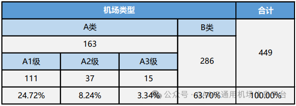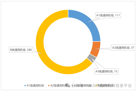 按照《通用机场分类管理办法》,截至2023年12月31日,全国A类通用机场数量达163个,占比36.30%,其中A1级通用机场达111个,占所有通用机场数量的24.72%,A2、A3级通用机场分别为37个和15个,占比为8.24%和3.34%;B类通用机场数量达286个,占比63.70%。与去年同期相比, A1级通用机场数量新增16个,增幅较大,A2级通用机场数量新增1个;B类通用机场是新增热点,新增33个,得益于B类通用机场与仅供直升机运行的机场可通过通用机场信息管理系统(http://gaa.caac.gov.cn)线上备案方式纳入行业管理的便利性。