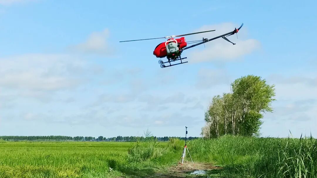 (2018年齐齐哈尔一架电动单旋翼植保无人机在稻田喷洒作业中)
