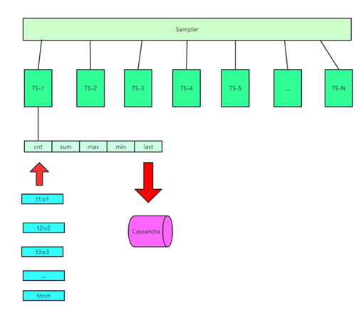 流式抽样的核心处理思想如上图所示:在HoraeDB的内存中保存了每个时间序列。每个序列上都维护了当前这个序列的cnt、sum、max、min、last等值,随着时间的推移,时序数据点源源不断的流入,相应序列上的cnt、sum、max、last都会进行累加或者值更新,当到达设定的时间窗口,比如10分钟,就会将计算后的结果存入到Cassandra中。