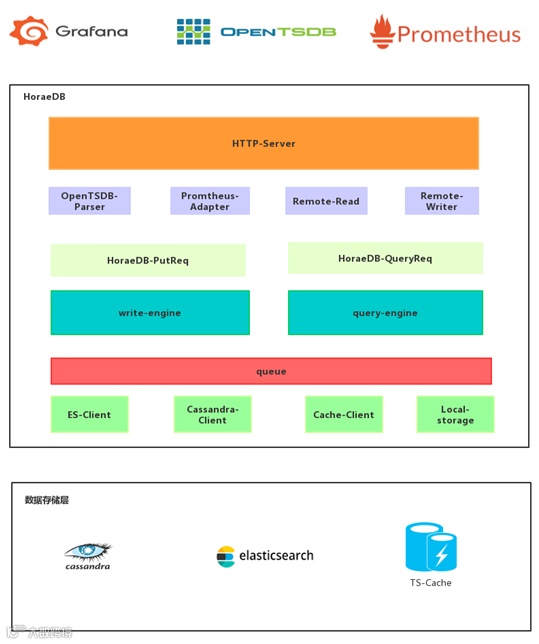 HoraeDB协议层:包括HoraeDB-PutReq和HoraeDB-QueryReq,这一层主要是定义好HoraeDB自身写入的数据的结构和查询请求的结构;