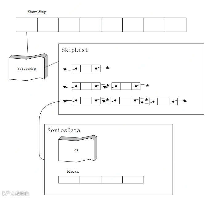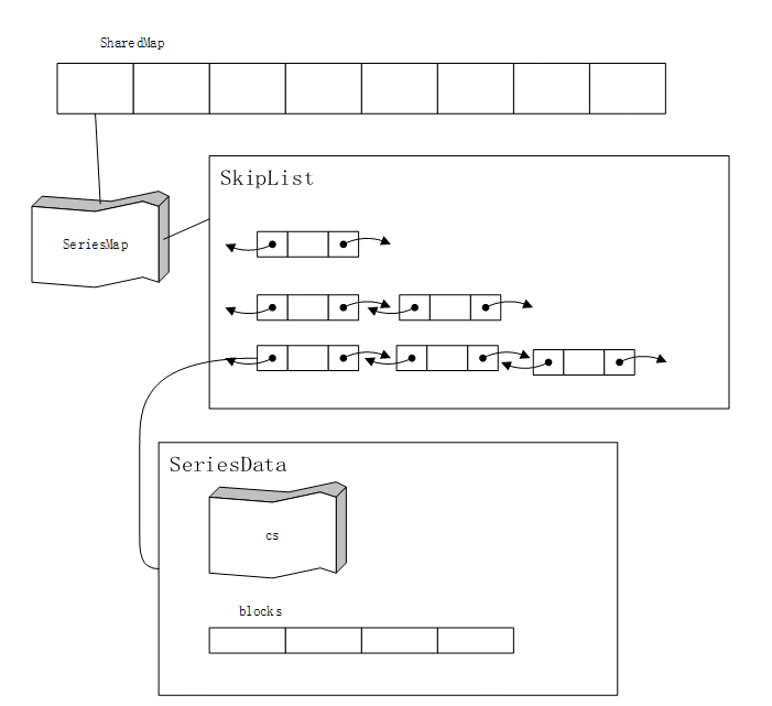 数据在内存中的组织如上图所示,数据的顶层是一个SharedMap,它其实就是一个数组,目的是用来在内部对时序数据进行分片,降低gc对服务性能的影响,以及适当的减小锁的粒度,提升服务的读写性能。数据中的一个项就是SeriesMap,用来保存时序数据项和它的时序数据点的值,其内部的核心数据结构是一个跳表,跳表中的每一项对应的是一个时序数据中的一个项,在这边用SeriesData来进行表示。