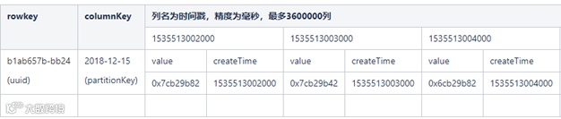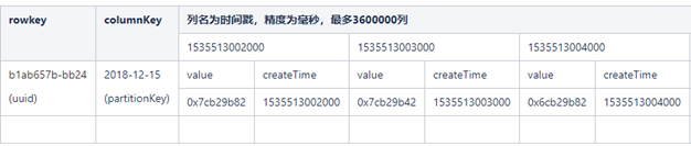 列定位:每列由数据的时间戳来表示,每个时序点占一列,每列中包含value和createTime字段。value是经过编码后的数据,createTime是由时序数据点到来的时间计算出的timeUUID来表示,用于支持多版本的特性。