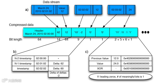 Timestamp根据时间关联的条目进行差值计算、以及差值的差值计算得到占用字节数非常小的数值并进行保存。同样Value使用XOR算法进行计算得到占用存储更小的数值进行保存。