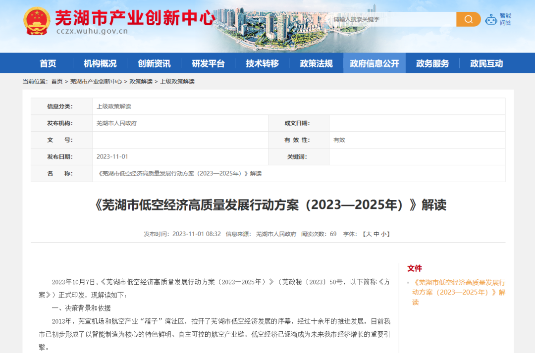 今年10月7日,芜湖市人民政府曾发布《芜湖市低空经济高质量发展行动方案(2023-2025年)》,规划全市低空经济“内涵式发展、高质量提升”,成为全国低空经济发展先行区、集聚区和示范区。此次安徽印发的《方案》进一步确定了五个发展目标、六项重点任务以及具体组织实施方案。《方案》明确,到2025年,芜湖市通用航空和无人机产业规模力争达到500亿元,相关企业数量突破300家,其中规模以上企业达到150家,新增省级以上专精特新企业15家以上,新增省级以上科技创新和公共服务平台5个以上。重点任务包括完善航空基础设施、促进产业集聚发展、增强科技创新支撑、开发开放应用场景、统筹推进先行先试、营造产业发展生态六个方面、21项工作。